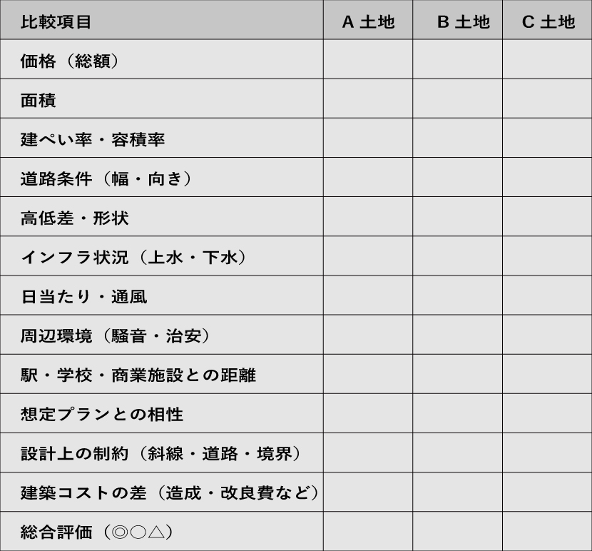 土地探しのコツ|3つの土地から最適解を選ぶ:比較表と設計者の視点